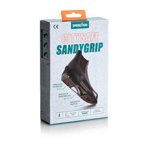 SandyGrip är broddar som du enkelt kan ta på och av. De passar alla skor och promenadskor. Broddarnas keramiska plattor ger ett bra grepp och en trygg upplevelse när du promenerar in och ut ur butiker i stan eller vid promenader där du vistas växelvis i inomhus- och utomhusmiljö.